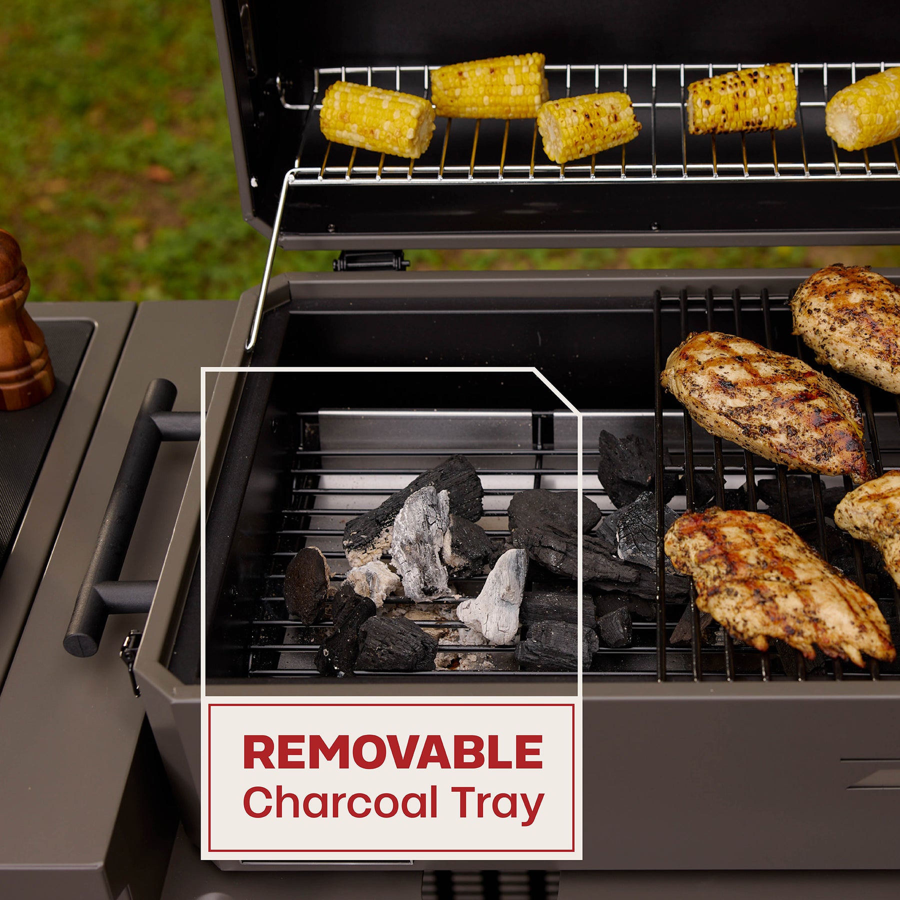 3. Removable charcoal tray for convenient loading and cleanup.